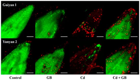 The effects of Cd and exogenous GB on the cell vigor in the root tips of Guiyan1 and Yunyan2 detected by an flurescein diacetate-propidium iodide (FDA-PI) dual fluorescent dye after 15 days of Cd exposure: The green and red fluorescence indicate the fluorescent dye in living and dead cells, respectively. Control, GB, Cd, and Cd + GB correspond to BNS + foliar spray of deionized water, BNS + foliar spray of 500 μM GB, BNS + foliar spray of deionized water + 5 μM CdCl2, and BNS + foliar spray of 500 μM GB + 5 μM CdCl2, respectively. Scale bars = 250 µm. The figure is representative of three different experiments.