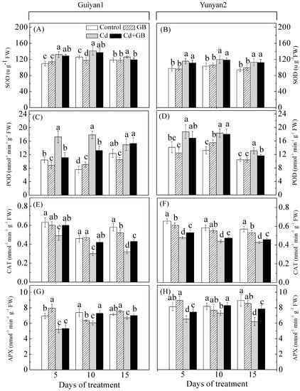 The effects of Cd and exogenous GB application on the superoxide dismutase (SOD) (A,B), peroxidase (POD) (C,D), catalase (CAT) (E,F), and ascorbate peroxidase (APX) (G,H) activity in the roots of two tobacco cultivars exposed to 5 µM Cd for 5, 10, and 15 days: The error bars represent the SD values (n = 3). The different letters indicate the significant differences (p < 0.05) among the 4 treatments within each sampling date. Control, GB, Cd, and Cd + GB correspond to BNS + foliar spray of deionized water, BNS + foliar spray of 500 μM GB, BNS + foliar spray of deionized water + 5 μM CdCl2, and BNS + foliar spray of 500 μM GB + 5 μM CdCl2, respectively.