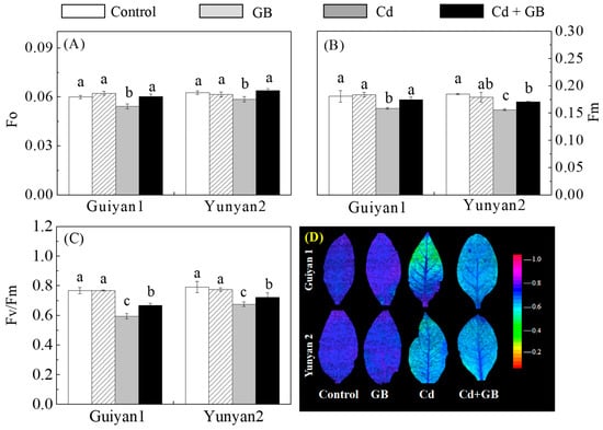 The effects of Cd and exogenous GB on the fluorescence parameters (A–C) and the Fv/Fm false color images (D) of Guiyan1 and Yunyan2 after 15 days of Cd exposure. Fo, minimal fluorescence yield (A); Fm, maximal fluorescence yield (B); and Fv/Fm, maximum quantum yield of PSII (C). The error bars represent the SD values (n = 3). The different letters indicate the significant differences (p < 0.05) among the 4 treatments within each cultivar. Control, GB, Cd, and Cd + GB correspond to BNS + foliar spray of deionized water, BNS + foliar spray of 500 μM GB, BNS + foliar spray of deionized water + 5 μM CdCl2 and BNS + foliar spray of 500 μM GB + 5 μM CdCl2, respectively. The figure is representative of three different experiments.