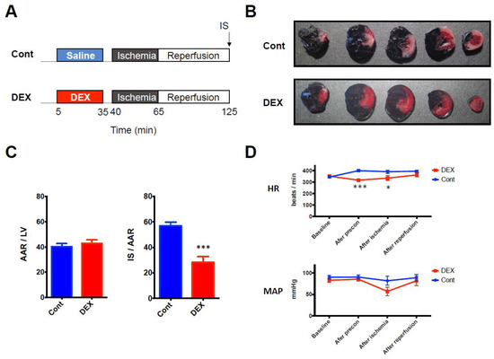 (A) I/R experimental protocol. (B) Representative LV cross sections. (C) Corresponding analysis of AAR expressed as a percentage of LV and IS expressed as a percentage of AAR. (D) Hemodynamic parameters during the experiment. N = 7 in each group. * p < 0.05, *** p < 0.001. AAR: area at risk, Cont: control group, DEX: dexmedetomidine group, HR: heart rate, I/R: ischemia reperfusion, IS: infarct size, LV: left ventricle, MAP: mean arterial pressure.