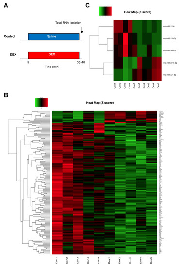 2.2. Identification of Differentially Expressed mRNAs and miRNAs after DEX Preconditioning