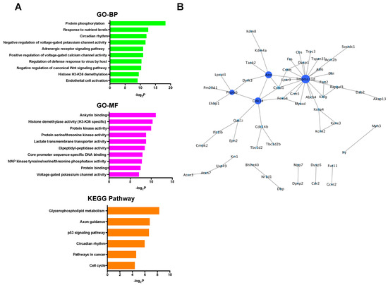 (A) GO and KEGG pathway analyses of the down-regulated mRNAs. (B) PPI network analysis among the down-regulated mRNAs. Blue color node indicates down-regulation. The size and color depth of nodes represent the number of interactions and the edges represent the relationships between genes. BP: biological process, GO: gene ontology, KEGG: Kyoto Encyclopedia of Genes and Genomes, MF: molecular function, PPI: protein-protein interaction.