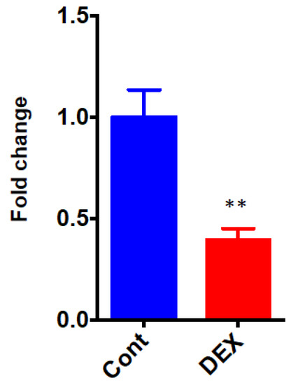 The differential the of Dusp1, a protein phosphatase that dephosphorylates MAPK, was validated by qRT-PCR. The expression level of Dusp1 was significantly down-regulated after administration of DEX (0.40 ± 0.06 in the DEX group vs. 1.00 ± 0.13 in the Control group, p = 0.0031) (Figure 7).