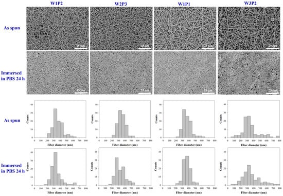 Scanning electron microscopy (SEM) images of electrospun fibers with different compositions of water-borne polyurethane (WPU) and poly-ethylene-oxide (PEO) before and after a phosphate-buffered saline (PBS) treatment: The respective distributions of fiber diameter are plotted as histograms. The SEM images of W3P2 show the bead formation and loss of shape of the fibers after a PBS treatment. W1P1 contains more WPU than W2P3 and W1P2, and its fibers had a preserved shape after the PBS treatment, indicating the stability of the fibers.