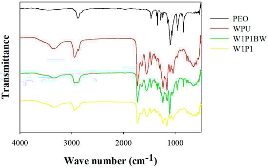 To remove PEO in obtaining pure WPU fibers, the electrospun fibers were washed with a PBS solution. The extraction of PEO was monitored using Fourier transform infrared spectroscopy (FTIR). Figure 2 presents the FTIR spectra of one of the investigated compositions (W1P1) before and after PBS treatment. In the spectrum obtained before the PBS wash (depicted as W1P1BW in Figure 2), there was a band centered at approximately 1120 cm−1, which was attributed to the C–O–C stretching vibration of PEO. This band was absent in the spectrum obtained after the fibers were treated with PBS (depicted as W1P1 in Figure 2). In addition, the spectrum of the fibers after PBS treatment (W1P1) revealed the same absorption as that in the spectrum of pure WPU (depicted as WPU in Figure 2). On the basis of the FTIR findings, we infer that PEO could be completely removed from the electrospun fibers through PBS treatment.