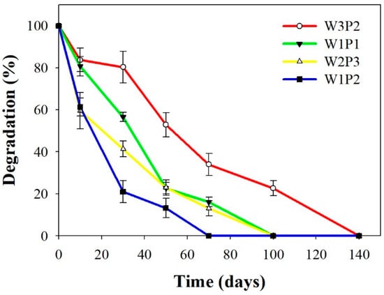 The in vitro degradation curves obtained at 30 °C for NFMs with different WPU/PEO volume ratios: W1P1 degradation took approximately 100 days.