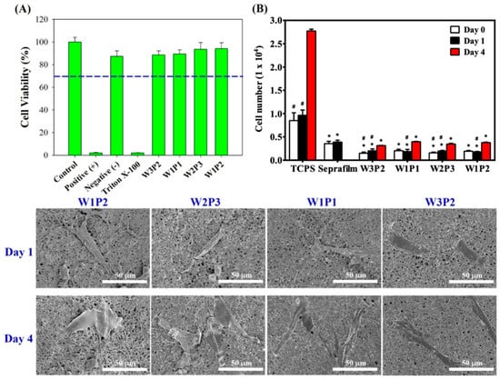 (A) The evaluation of cytotoxicity using MTT assays: NFMs with different WPU/PEO volume ratios had similar cell viabilities to the control and negative control, implying that the WPU NFMs are not toxic to human dermal fibroblasts (HDFs). (B) The HDF attachment and proliferation assay: HDFs were inoculated on different NFMs and tissue culture polystyrene (TCPS). The cell numbers on day 0, day 1, and day 4 were observed and evaluated using MTT assay. (Bottom rows) The SEM observation of the HDFs attached to NFMs, showing that the HDFs occupied a small area on all NFMs, which correlates with the findings presented in Figure 5B. * p < 0.05 when compared with TCPS, # p < 0.05 when compared with Seprafilm.