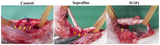 Gross observations of the repaired flexor digitorum profundus tendons in different groups: The yellow arrows indicate the sites of scar adhesion. Severe adhesion and scarring were noted in the surgical control group. For the tendons wrapped with Seprafilm, the adhesion was less severe compared with the surgical controls. The W1P1 NFM group exhibited the least adhesion and scarring around the repaired tendon.