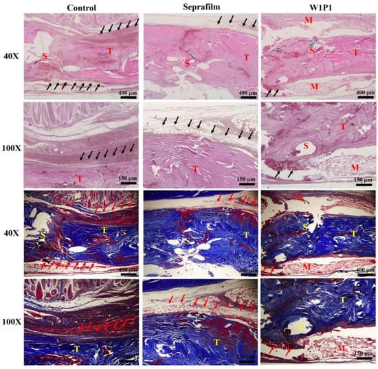 Histological sections stained with hematoxylin and eosin (H&E) (upper two rows) and Masson trichrome blue (lower two rows) of tendons receiving different treatments (S, surgical repair site; T, tendon; and M, material): The black (red) arrows indicate the scar tissue in H&E (Masson trichrome blue) stains. The control group exhibited the most scar tissue around the tendon, whereas the W1P1 group exhibited the least. The NFM can be seen in the W1P1 image, indicating that the material lasted more than 3 weeks. In the Seprafilm group, no remnants of the material were found through histological examination.