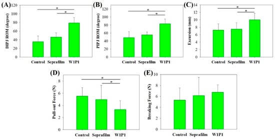 The range of motion of the PIP and DIP joints in the W1P1 NFM group were 97.1 ± 14.7 and 79.0 ± 12.4 degrees, respectively, while that in the Seprafilm group were 55.6 ± 7.3 and 46.3 ± 9.9 degrees and that in the control group were 48.8 ± 14.6 and 35.6 ± 13.2 degrees (Figure 8A,B). The W1P1 group exhibited a significantly better range of motion compared to the other two groups (p < 0.05).