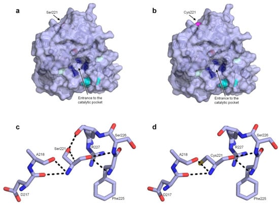 As can be seen in Figure 2c, Ser221 interacts with the surrounding Asp217, Ala218, Phe225, Ser226 and Arg227 residues through H-bonds. According to our model, the interaction of the OH from the side chain of Ser221 with the oxygen atom of the main chain of Arg227 may be interrupted after mutation, Figure 2d. Besides, the additional polar contact between the OH from Ser221 and a molecule of water, seems to be removed when introducing the Cys221 mutation. These two interruptions might be the reason behind the noticeable drop in secretion.
