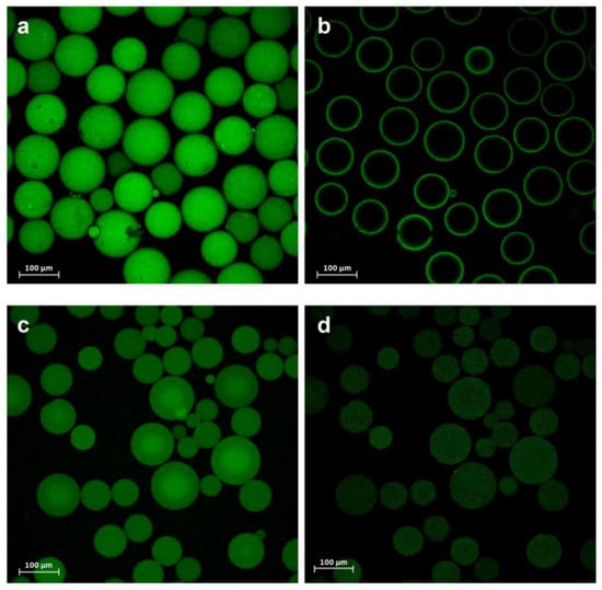 As expected, whilst PaDa-I did not appear to attach to C-II, there was a small amount of PaDa-I bound to C-I, probably as a result of adsorption to the polymethacrylate or non-selective covalent immobilization to the epoxy groups not SH activated (data not shown). Although C-I had an average pore diameter of 130 nm, with an average pore volume of 1.19 cm3 g−1 and a specific surface area of 43 m2 g−1 [], the PaDa-I-Cys was mainly immobilized on the surface of the carrier (Figure 3a,b), as also seen previously with an immobilized sterol esterase on similar carriers []. Unlike C-I, the higher swelling factor of C-II (4–5 mL per gram of gel) allowed the PaDa-I-Cys to diffuse through the pores, accessing the inner structure of the carrier, Figure 3c,d. Thus, despite the weaker fluorescence intensity for C-II, the total activity recovered was the same, indicating a similar amount of the PaDa-I-Cys mutant attached to both supports.