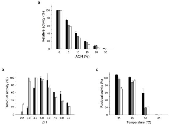 Biochemical characterization. (a) Activity in the presence of ACN; (b) pH stability and (c) thermostability after a 1 h incubation (the value for 100 % of activity was taken as the initial activity of each enzyme without incubation at room temperature, 25 °C). Activity was measured in sodium phosphate/citrate buffer (pH 4.4, 100 mM) containing ABTS (0.3 mM) and H2O2 (2 mM). Black bars, PaDa-I-Cys immobilized on C-II; grey bars, free PaDa-I-Cys; white bars, PaDa-I.