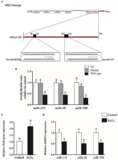 Conserved binding site of miR-153, miR-28 and miR-708 are located between 105–112 and 58–65, respectively in bovine Nrf2 3′-UTR (A). The luciferase firefly activity is reduced in granulosa cells co-transfected with bta-miR-153, miR-28 and miR-708 mimics with the wild type pmiRGlo expression vector (B). H2O2-induced oxidative stress increased cellular mRNA expression level of Nrf2 (C), as well as decreased miR-153, miR-28 and miR-708 expression level (D). qRT-PCR analysis of Nrf2, miR-153, miR-28 and miR-708 in granulosa cells under normal condition (white bar) and oxidative stress condition (black bar). Data are presented mean ± SEM of three independent biological replicates. Bars with different letters (a,b) showed statistically significant differences (p < 0.05).