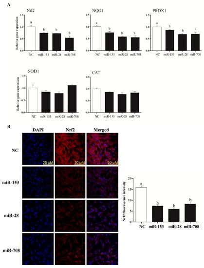 Quantitative RT-PCR of Nrf2 and its downstream antioxidants in bovine granulosa cells co-transfected with miR-153, miR-28 and miR-708 mimics (A). Immunocytochemistry of Nrf2 in bovine granulosa cells co-transfected with miR-153, miR-28 and miR-708 mimics (B). Data are presented as mean ± SEM of three independent biological replicates. Bars with different letters (a,b) showed statistically significant differences (p < 0.05).
