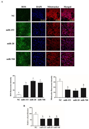 2.4. Overexpression of miR-153 or miR-28 and miR-708 Increased Intracellular ROS Level, Reduced Mitochondrial Activity and Cell Proliferation Rate in Bovine Granulosa Cells