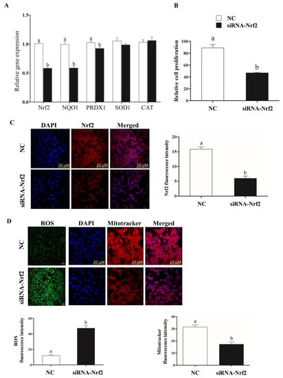 Selective knockdown of Nrf2 reduced cellular mRNA expression level of Nrf2 and its downstream antioxidant genes (A). Selective knockdown of Nrf2 reduced bovine granulosa cell proliferation (B). Immunocytochemistry of Nrf2 in bovine granulosa cells co-transfected with siRNA targeting the Nrf2 (C). Moreover, higher intracellular ROS level and reduced mitochondrial activity (D) was observed in Nrf2-knockdown cells compared to the control counterparts. White bars indicate the cells transfected with the NC and the dark bars indicate cells transfected with siRNA targeting Nrf2. Data are presented as mean ± SEM of three independent biological replicates. Bars with different letters (a,b) showed statistically significant differences (p < 0.05).