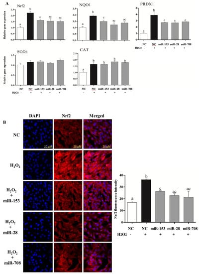 In order to cross-validate the regulatory role of miR-153, miR-28 and miR-708 in Nrf2 suppression, the Nrf2 expression was selectively suppressed using siRNA. Cells co-transfected with siRNA-Nrf2 showed a significant reduction of Nrf2 mRNA and protein level compared to negative control (Figure 4A,C).