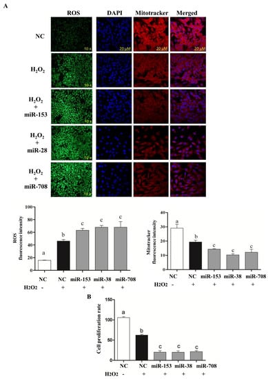The effects of miR-153, miR-28 and miR-708 overexpression and the rescuing role of Que on bovine granulosa cells when subjected to oxidative stress condition were investigated. For this, cells were treated with 5 µM H2O2 for 40 min [], then transfected with miRNA mimics or supplemented with 10 µM Que. Twenty-four hours post-treatment, cells were subjected to intracellular ROS level, mitochondrial activity, cellular proliferation rate and Nrf2 expression pattern analyses.