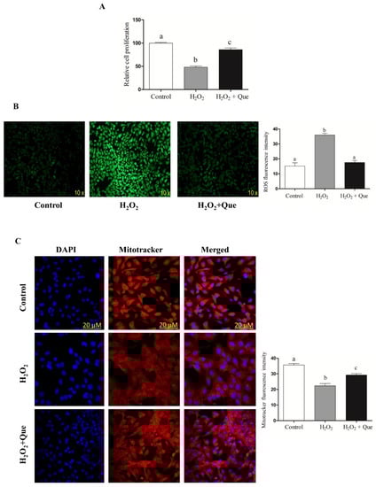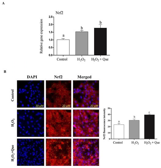 To assess the rescuing role of Que, bovine granulosa cells exposed to oxidative stress for 40 min were then treated with 10 µM Que. Results showed that treatment of cells with Que resulted in upregulation of Nrf2 (Figure 7A,B), accompanied by increased cellular proliferation rate (Figure 8A), reduced intracellular ROS level (Figure 8B) and increased mitochondrial activity (Figure 8C) in H2O2-Que treated cells compared to H2O2 treated alone, suggesting the rescuing effect of Que against oxidative stress condition through activation of Nrf2 signaling pathway.