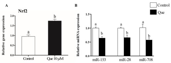 Quercetin increased cellular mRNA expression level of Nrf2 (A). The expression of miR-153, miR-28 and miR-708 was downregulated following quercetin treatment of cells (B). White bar represent the control groups and dark bars represent quercetin treated group. Data are presented as mean ± SEM of three independent biological replicates. Bars with different letters (a,b) showed statistically significant differences (p < 0.05).