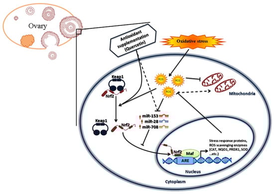 Model of the Nrf2-mediated oxidative stress response pathway in bovine granulosa cells under moderate oxidative stress conditions and under antioxidant (quercetin) supplementation. Oxidative stress and Que modulate Nrf2 post transcriptionally through the inhibition of miR-153, miR-28 and miR-708, which targeted bovine Nrf2. After that, Nrf2 protein was activated and localized to the nucleus, where it binds to the antioxidants reactive element (ARE) in the promoters of antioxidant genes. This activates antioxidant gene expression so the respective proteins can scavenge the excessive ROS and subsequently maintain the activity of mitochondria.