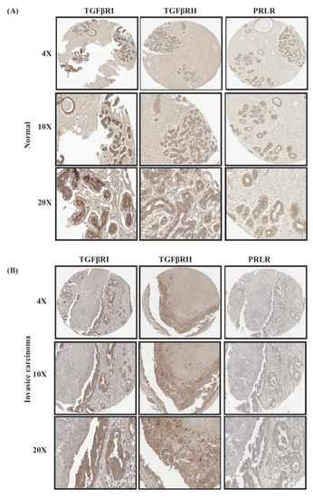 Representative images of co-expression of PRLR with both TGFβ receptors in (A) normal/benign samples; (B) invasive breast cancer samples.