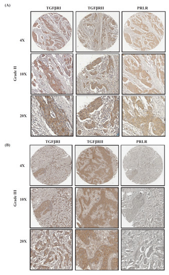 Representative images of co-expression of PRLR with both TGFβ receptors in (A) grade II tumors compared to (B) grade III tumors.