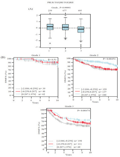 PRLR/TGFβRI/TGFβRII gene signature and its association with tumor grade and patient outcome. (A) Boxplot of PRLR/TGFβRI/TGFβRII gene signature in 1881 breast cancer cases from the GOBO database stratified according to histological grade. The band inside the box represents the median. The top and bottom of the box indicate the distance between quartile 1 (Q1), quartile 3 (Q3) and 1.5 times the interquartile range. In addition, the circles (when present) indicate the outliers. (B) PRLR/TGFβRI/TGFβRII gene signature and its association with patient outcome using distant metastasis-free survival (DMFS) as an end point in different tumor grades using 1881 breast cancer cases from the GOBO database.