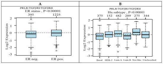 The expression level of PRLR/TGFβRI/TGFβRII gene signature and its association with estrogen receptor (ER) status and breast cancer molecular subtypes. (A) Boxplot of PRLR/TGFβRI/TGFβRII gene signature in 1881 breast cancer cases from the GOBO database stratified according to ER status. The band inside the box represents the median and the top and bottom of the box indicate the distance between the quartile 1 (Q1), quartile 3 (Q3) and 1.5 times the interquartile range. The circles indicate the outliers. (B) PRLR/TGFβRI/TGFβRII gene signature and its association with breast cancer molecular subtypes (Hu classification) using 1881 breast cancer cases from the GOBO database.