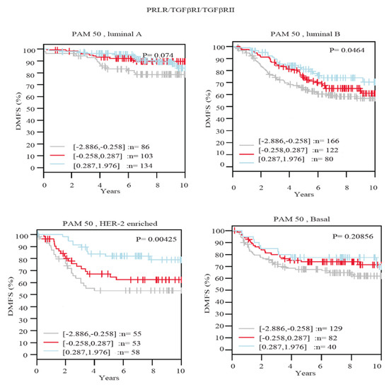 To further evaluate the clinical value of PRLR co-expression with TGFβ receptors in breast cancer, the correlation of the expression of the three receptors was examined in relation to patient survival outcomes using distant metastasis-free survival (DMFS) as an endpoint in the GOBO database. Importantly, as can be seen in Figure 5, breast cancer cases showing high expression of the three receptors showed significantly better survival outcomes in HER-2-enriched (p = 0.00425) and luminal B (p = 0.0464) subtypes. Furthermore, while high co-expression of the three receptors showed better survival outcomes in luminal A and basal-like breast cancer subtypes, this effect did not show a statistical significance. Together, these results emphasize that breast cancer patients that maintain the expression of the three receptors are less likely to develop distant metastasis in comparison to patients showing low expression levels.