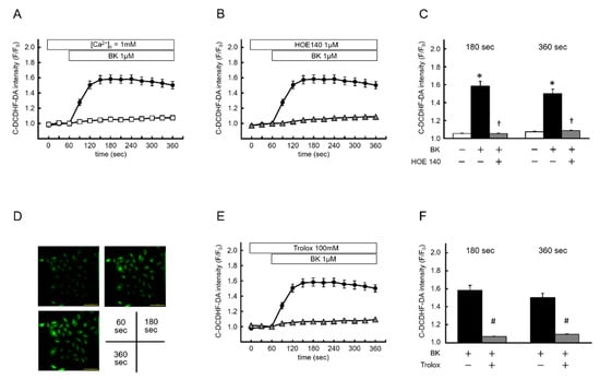 In the following series of experiments, we investigated the effect of BK on cytosolic ROS production in primary cultured PAECs loaded with the ROS indicator 6-carboxy-2′ 7′-dichlorodihydrofluorescein di-(acetate, di-acetoxymethyl ester) (C-DCDHF-DA, 5 µM). Figure 2A shows the time course of changes in the C-DCDHF-DA intensity. In the presence of 1 mM extracellular Ca2+, 1 µM of BK rapidly increased the fluorescence intensity of C-DCDHF-DA, which reached the maximum level in 180 s, followed by a sustained increase (F/F0 = 1.58 ± 0.05 at 180 s, 1.50 ± 0.05 at 360 s; p < 0.05 versus control). This was inhibited by 1 µM of HOE 140, which is an inhibitor of the bradykinin B2 receptor (F/F0 = 1.05 ± 0.003 at 180 s, 1.09 ± 0.01 at 360 s; p < 0.05 versus BK) (Figure 2B,C). Figure 2D shows representative two-dimensional images of endothelial cells obtained before and at 180 s and 360 s after administration of BK. To confirm that this increase of C-DCDHF-DA signal was caused by increasing cytosolic ROS generation, we evaluated the effect of the free radical scavenger trolox. When cells were pretreated with 100 mM trolox, the increase in the fluorescence intensity of C-DCDHF-DA caused by BK disappeared (Figure 2E,F) (BK: F/F0 = 1.58 ± 0.05 at 180 s, 1.50 ± 0.05 at 360 s; trolox: F/F0 = 1.07 ± 0.003 at 180 s, 1.09 ± 0.01 at 360 s; p < 0.05). This result indicates that BK stimulation increased the cytosolic ROS.