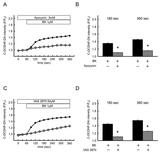 To confirm that BK-induced ROS generation was NOX-dependent, we investigated the effects of NOX inhibitors. Pretreatment with apocynin (3 mM) inhibited the effect of BK (BK: F/F0 = 1.36 ± 0.02 at 180 s, 1.33 ± 0.02 at 360 s; apocynin: F/F0 = 1.05 ± 0.002 at 180 s, 1.08 ± 0.003 at 360 s; p < 0.05) (Figure 3A,B). Furthermore, another NOX specific inhibitor, VAS2870 (50 µM), also significantly suppressed the effects of BK on ROS production (BK: F/F0 = 1.45 ± 0.04 at 180 s, 1.55 ± 0.01 at 180 s; VAS2870: F/F0 = 1.11 ± 0.002 at 180 s F/F0 = 1.25 ± 0.01 at 360 s; p < 0.05) (Figure 3C,D). These results indicated that BK-induced ROS production was caused by NOX activation.