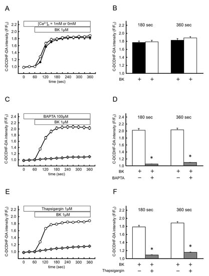 Ca2+ release from endoplasmic reticulum is required for bradykinin-induced reactive oxygen species production. (A,B) Time course of changes in C-DCDHF-DA intensity, and summarized data of C-DCDHF-DA intensity at 180 s and 360 s in Ca2+-free (open circle; n = 181) and 1 mM Ca2+ (closed circle; n = 263) modified Tyrode’s solution. (C,D) The same experiment as (A) conducted in Ca2+-free modified Tyrode’s solution with (open diamond; n = 174) or without BAPTA (open circle; n = 146). (E,F) The same experiment as (A) conducted in Ca2+-free modified Tyrode’s solution with (open diamond; n = 123) or without thapsigargin (open circle; n = 181). Data are expressed as the mean ± SEM of 3–5 independent experiments in separate cell culture wells. * p < 0.01 versus BK. Two-factor factorial ANOVA was used for analysis of difference.