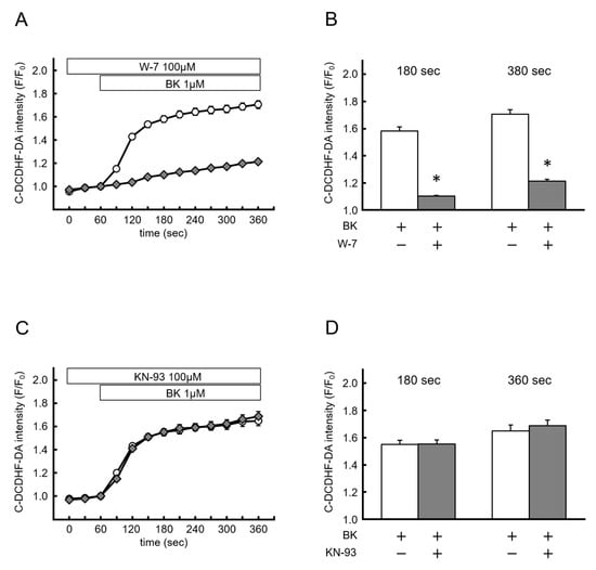 CaM, one of the most ubiquitous Ca2+-sensing proteins, regulates various cellular functions via activation of downstream kinases, such as CaMKII. To determine whether Ca2+/CaM and the CaMKII pathway were involved in BK-induced NOX-derived ROS production, we examined the effects of W-7 (a CaM inhibitor) and KN-93 (a CaMKII inhibitor) on BK-induced NOX-derived ROS production. With W-7 pretreatment (100 mM), the effect of BK on NOX-derived ROS production was completely abolished (BK: F/F0 = 1.58 ± 0.03 at 180 s, 1.71 ± 0.03 at 360 s; W-7: F/F0 = 1.10 ± 0.01 at 180 s, 1.21 ± 0.01 at 360 s; p < 0.05) (Figure 5A,B). However, KN-93 (100 µM) did not show an inhibitory effect on BK-induced NOX-derived ROS production (BK: F/F0 = 1.55 ± 0.03 at 120 s, 1.64 ± 0.04 at 180 s; KN-93: F/F0 = 1.55 ± 0.03 at 120 s, 1.69 ± 0.04 at 360 s, not significant) (Figure 5C,D). These results indicated that BK-induced NOX-derived ROS production was mediated via a Ca2+/CaM-dependent, CaMKII-independent pathway.