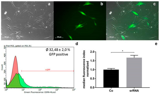 Transfection of jaw periosteal cells (JPCs) with self-replicating RNA (srRNA). (a–c) Representative (a) brightfield, (b) green fluorescent protein (GFP), and (c) merged images of JPCs 24 h after srRNA transfection. (d) Representative histogram of flow cytometry measurements of untransfected (red) and srRNA transfected (green) JPCs 24 h after transfection. (e) Average normalized median fluorescence index (MFI) values + standard deviation (SD) of srRNA transfected and untransfected (Co) JPCs relative to MFI values of untransfected (Co) samples were calculated and compared using Student’s t-test (n = 3, * p < 0.05).