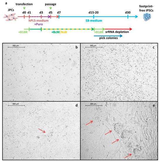 Reprogramming of JPCs. (a) Timeline of JPC reprogramming. JPCs were transfected (d0) in hPL5-medium containing 0.2 µg/mL B18R protein. On day one, the medium was changed to hPL5 containing 25% conditioned medium containing B18R (BcM) and 1.0 µg/mL puromycin (Puro). Puromycin selection was continued until day five (purple arrow). Cells were passaged on day five, and on day seven, the medium was changed to Essential 8 (E8) containing 25% BcM. Sodium butyrate (NaB) was added to the medium from day three to 15. When the first induced pluripotent stem cell (iPSC) colonies emerged, the medium was changed to E8 containing 0.2 µg/mL B18R protein. iPSC colonies were picked at day 15 or later. (b–e) Representative bright field images of JPCs during srRNA-based reprogramming. (b) Untransfected JPCs treated with puromycin at day five. (c) srRNA transfected JPCs treated with puromycin at day five. (d) srRNA transfected JPCs at day 12 with the first iPSC-colonies (indicated by a red arrow). (e) srRNA transfected cells at day 15 with iPSC-colonies (indicated by red arrows).