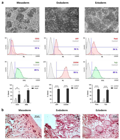 Therefore, cells were detached, fixed for 10 min at RT in fixation solution (R&D Systems) and washed with DPBS. Then, the cells were incubated for 45 min at RT with wash buffer (Wash Buffer I, R&D Systems) containing 5 µl of each of the following antibodies: Mesoderm differentiation: Alexa Fluor 488 labelled anti-human α-smooth muscle actin (α-SMA) antibody (R&D Systems) and PE labelled mouse anti-human CD31 antibody (BD Biosciences), Endoderm differentiation: PE-labelled anti-human C-X-C chemokine receptor type 4 (CXCR4) antibody and PE-labelled anti-human α-fetoprotein (AFP) antibody (both from R&D Systems, Minneapolis, USA), Ectoderm differentiation: Alexa Fluor 488 labelled anti-human neuron-specific class III β-tubulin (Tuj1) antibody (BD Biosciences) and PE-labelled anti-human paired box gene 6 (Pax6) antibody (Miltenyi). After washing with wash buffer, cells were fixed using CellFIX solution (BD Biosciences) and analyzed using FACScan flow cytometer (BD Biosciences) and Flowing Software (Turku Centre for Biotechnology, Turku, Finland).