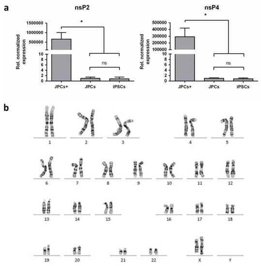 After the successful generation of iPSCs, the presence of srRNA in the cells was analyzed. Therefore, qRT-PCR was performed with RNA isolated from JPCs and JPC-derived iPSCs and primer pairs specific to the nsP2 and nsP4 sequences. JPCs transfected with srRNA and cultivated for 48 h, served as positive control (JPC+). These samples showed high amounts of nsP2 and nsP4 compared to untransfected JPCs and iPSCs (Figure 5a). In contrast, the nsP2 and nsP4 amount measured in iPSCs was similar to that of untransfected JPCs, which demonstrates the absence of srRNA in the reprogrammed cells. Karyotyping of JPC-derived iPSCs resulted in normal karyograms without chromosomal aberrations (Figure 5b).
