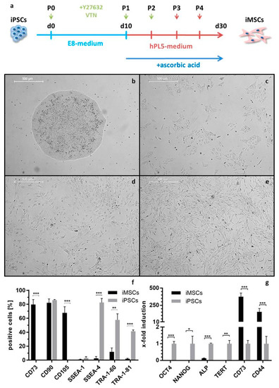 Differentiation of iPSCs into iPSC-derived mesenchymal stem/stromal like cells (iMSCs). (a) Timeline: iPSCs were seeded onto vitronectin coated plates in the presence of the ROCK inhibitor Y27632 and cultivated for 10 days in E8 medium (light blue line). Thereafter, human platelet lysate hPL5 medium containing 150 µM ascorbic acid was added to the cells (red line). Cells were passaged 3–5 times until they showed homogeneous MSC-like morphology after approximately 30 days. (b–e) Change of morphology during the differentiation of iPSCs into iMSCs. (b) iPSC colony before differentiation. (c) Cells after single cell plating in passage 0. (d) Differentiating iMSCs in passage two and (e) iMSCs in passage four (scale bars represent 500 µm). (f) Surface marker expression of iMSCs compared to iPSCs detected by flow cytometry. (g) Gene expression levels of iMSCs were normalized to levels of the housekeeping gene glyceraldehyde 3-phosphate dehydrogenase (GAPDH) and presented as x-fold induction relative to iPSCs (set to 1). Differences in surface marker, and gene expression were compared using Student’s t-test. (n = 3, * p < 0.05, ** p < 0.01, *** p < 0.001).
