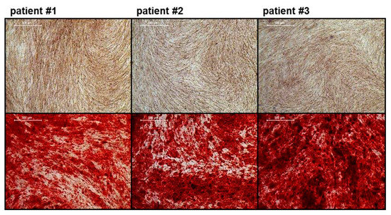 To demonstrate the functionality of iMSCs and their potential to be used for BTE applications, iMSCs were subjected to osteogenic differentiation. To differentiate the iMSCs under xeno-free conditions, cells were treated with osteogenic medium supplemented with human platelet lysate (hPL) instead of fetal bovine serum (FBS). After 15–20 days of differentiation, cells were fixed, and calcium phosphate precipitation was stained with alizarin red. As displayed in Figure 7, all iMSCs were able to produce strong mineral deposits.