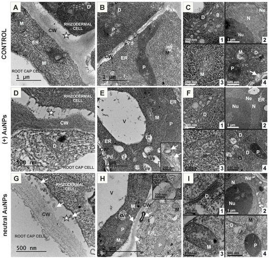 Ultrastructure of rhizodermal cells from the control roots (A–C); treated with (+) AuNPs (D–F) and neutral AuNPs (G–I). CW—cell wall, D—dictyosome, ER—endoplasmic reticulum, M—mitochondria, N—nucleus; Ne—nuclear envelope; Nu—nucleolus; P—plastid; Pd—plasmodesmata; V—vacuole; Ve—vesicle; arrows—paramural bodies; asterisks—periplasmic spaces.