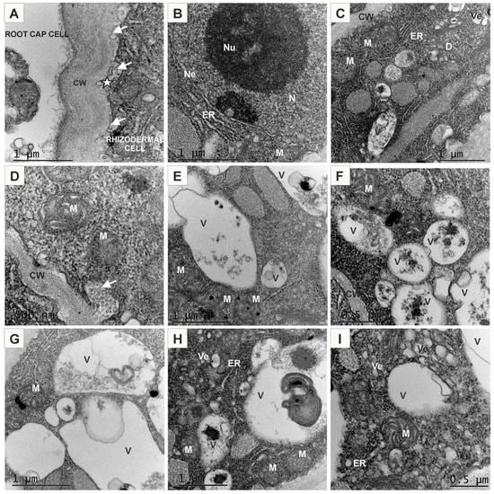 Ultrastructure of rhizodermal cells from the roots treated with (−) AuNPs (A–I). CW—cell wall; D—dictyosome; ER—endoplasmic reticulum; L—leucoplast; M—mitochondria; N—nucleus; Ne—nuclear envelope; Nu—nucleolus; Pd—plasmodesmata; V—vacuole; Ve—vesicle; arrows—paramural bodies; asterisk—periplasmic space.