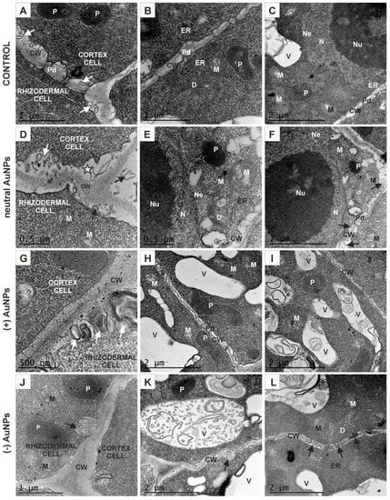 The ultrastructure of the cortical cells from the MZ of control roots was similar to rhizodermal cells (Figure 4A–C). Treatment with AuNPs revealed increased secretion since a large amount of paramural bodies with different size and shape were observed comparing to the control (Figure 4A,B,D,F,G,K,J,L, arrows). All cortical cells and rhizodermal/cortical cells were syplasmically connected as the plasmodesmata were found in the relevant walls (Figure 4A–C,F,H). Under neutral AuNP conditions, the cytoplasm was less electron-dense and there were numerous small vacuoles (Figure 4E,F) or one big vacuole that occupied centre of the cell and also few or no vesicles in the vicinity of dictyosomes (Figure 4E). Conversely, in the (−) AuNPs treated roots, dictiosomes seemed to have increased reduction of vesicles (Figure 4L) compared to the control (Figure 4B). In the (+) AuNPs and (−) AuNPs treated roots, cortical cells contained numerous vacuoles of different size which mostly contained membranous or vesicular structures of different shape (Figure 4H,I,K,L).