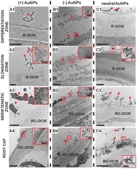 Ultrastructure of Arabidopis thaliana root surface along all of root zones. AuNPs regardless of their surface charge: (+) AuNPs (A1–A4), (−) AuNPs (B1–B4) and neutral AuNPs (C1–C4) did not pass the cell wall and they were retained on the root surface; red arrows indicate AuNPs, insets—high resolution images of AuNPs. R-OCW—root outer cell wall, RC-OCW—root cap outer cell wall. Scale bars: A1–A4, C1–C4 = 500 nm; B1–B4 = 200 nm.