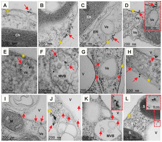 Ultrastructure of Arabidopsis protoplasts treated with (−) AuNPs (A–L). (−) AuNPs passed through the PM that provided the first barrier between the environment and cytoplasm. (−) AuNPs were detected on the PM surface, bound to the PM or in cytoplasm just below PM (A,B,H). They were also mostly found in the vesicles or in the vicinity of the vesicles (C,D,E,G), in the multivesicular bodies (I), in the cytoplasm (G,H,J) or in the vacuole (H,V,J,K,L); red arrows indicate the presence of AuNPs; yellow asterisks indicate plasma membrane barrier; Ch—chloroplast; ER—endoplasmic reticulum; M—mitochondria; MVB—multivesicular body; S—starch grain; V—vacuole; Ve—vesicle.
