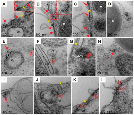 Ultrastructure of Arabidopsis protoplasts treated with (+) AuNPs (A–L). (+) AuNPs passed through the PM that provided the first barrier between the environment and cytoplasm. (+) AuNPs were found on the outer and inner side of PM and associated to PM (A–C). They were also observed in the membranous compartment, among others in endoplasmic reticulum (B,C); in the vesicles or in the vicinity of the vesicles (D–F,J), in the multivesicular bodies (G,I), in the cytoplasmic compartments (E,H,K,L) or in the vacuole (I,J); red arrows point to AuNPs; yellow asterisks indicate plasma membrane; ER—endoplasmic reticulum; M—mitochondria; MVB—multivesicular body; S—starch grain; V—vacuole; Ve—vesicle.