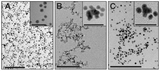 High-resolution transmission electron micrographs of different 5 nm AuNPs: (A) neutral, (B) negatively and (C) positively charged nanogold. Insets indicate high magnification of selected AuNPs. Scale bars: A–C = 100 nm; insets A–C = 20 nm.