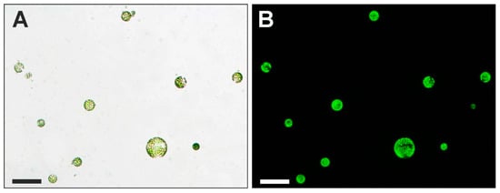 Freshly isolated protoplasts: (A) bright field and (B) stained with FDA—test of protoplast viability (UV light). Scale bars: 100 µm.