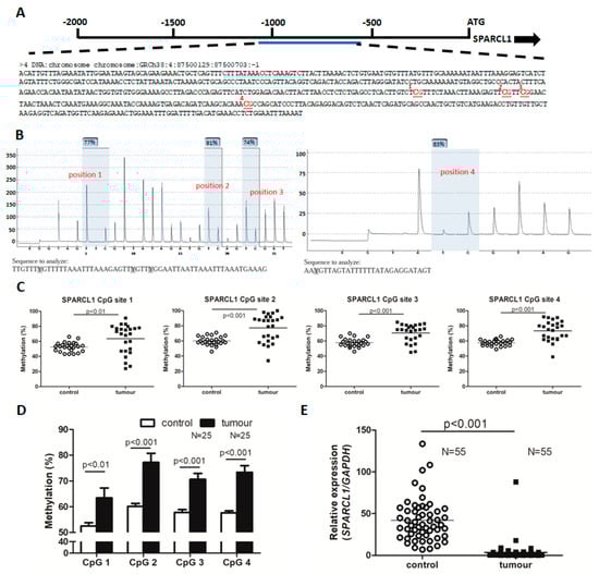 A total of 500 ng of DNA from each sample was treated using the EZ DNA Methylation-Lightning Kits Bisulfite Conversion System (Zymo Research, Irvine, CA, USA) and the converted DNA was eluted in 20 μL of the elution buffer. Bisulfite conversion was performed in the dark at 98 °C for 10 min and 64 °C for 3.5 h, followed by desulphonation of the converted DNA. Gene amplification was performed using the HotStarTaq® Master Mix Kit (Qiagen). The CpG1, CpG2, and CpG3 sites of SPARCL1 pyrosequencing primers used were as follows: forward: 5′-GGTGTGTGGGAAAAGTTTTAGAT-3′; reverse: 5′-CCAAATTTCCAATTTCTCTTAAACC-3′; sequencing: 5′-TTATTTAATTTTTTTGAGTTTTAT-3′. The CpG4 of SPARCL1 pyrosequencing primers used were as follows: forward: 5′-GTGGGAAAAGTTTTAGATTTAGAGTT -3′; reverse: 5′-CCAAATTTCCAATTTCTCTTAAACC-3′; sequencing: 5′-AAAAGTGAGATAGATTAAGTATA-3′. Amplification conditions were as follows: 95 °C for 15 min, 94 °C for 30 s, 60 °C for 30 s, 72 °C for 30 s, 45 cycles. To assay DNA methylation levels of the SPARCL1 promoter, bisulfite sequencing was performed on the PyroMark Q24 instrument (Qiagen). Relative levels of methylation at each CpG site were analyzed with PyroMark Q24 version 2.0.6 software.
